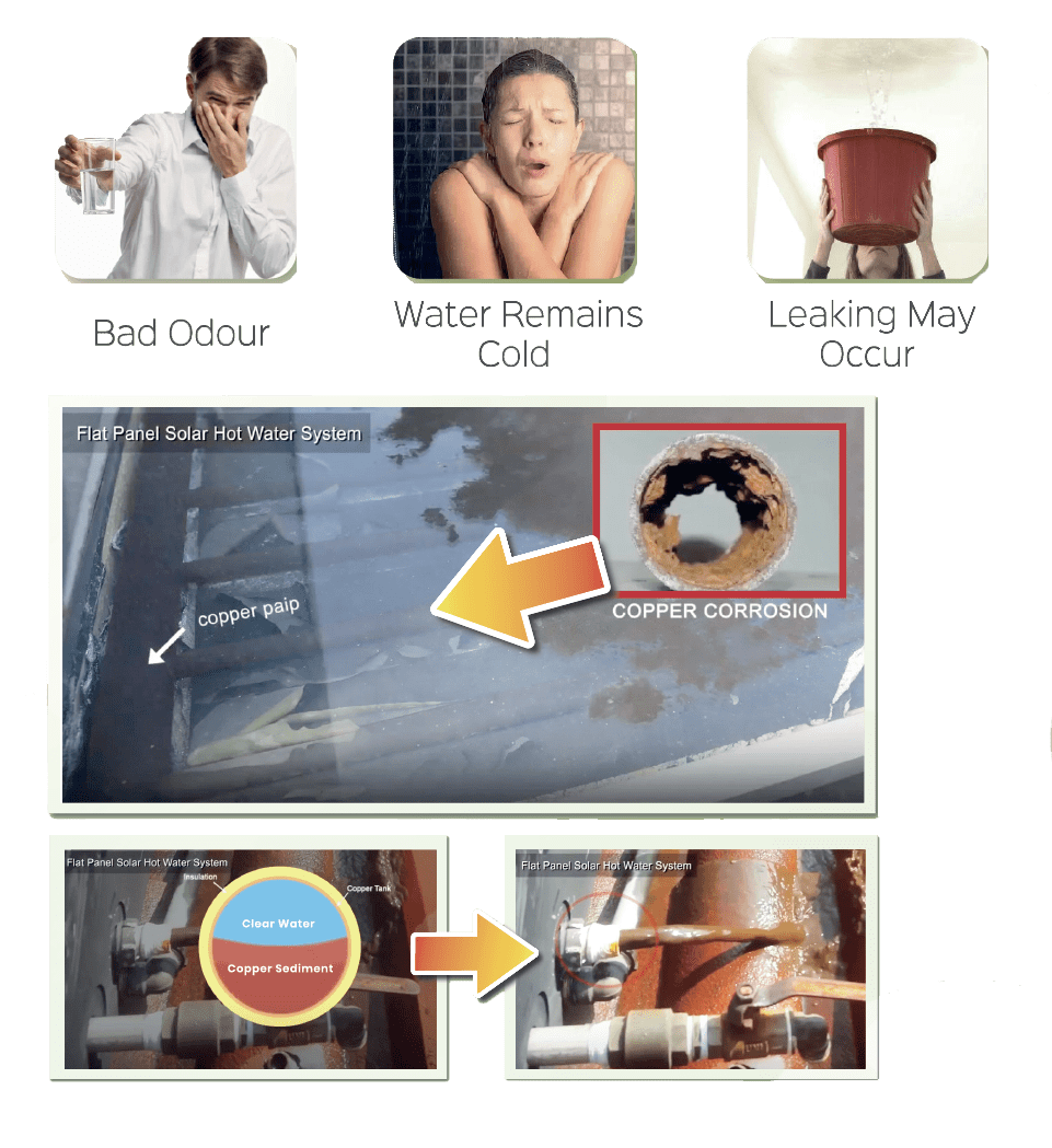 For many years, old flat panel solar water systems were the most common type of solar water heaters on the market. Since the introduction of this technology to the Malaysian market back in the 1980s, many issues customers would face began to surface throughout the years. The Efficiency of the Solar Collector is Low, Water Remains Cold during a Cloudy Day, Leaking caused by the number of joints between the collector and the tank, corrosion of copper pipes in the collector or tank, Copper Poisoning can occur and harm our health, High Maintenance required. And last but not least, this old technology still remains at a high price even today!